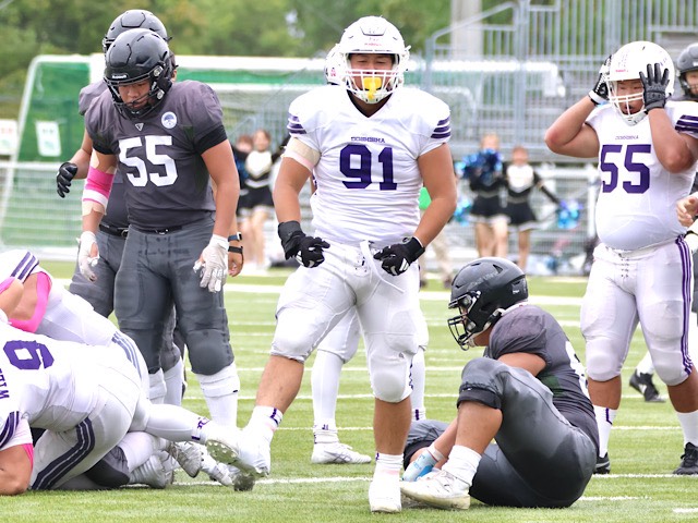 第4Qは京大のセカンドダウンが自陣16㍎から始まった。すると、#99伊達(経2)のQBサックが飛び出し、ファーストダウン更新を阻止。続けて、#83小林(社3)の約30㍎のロングリターンで敵陣24㍎まで戻した。序盤から流れをつかんだ同志社。このシリーズでTDの奪い返しを狙うも、ゴール前でインターセプトを喫し無得点に終わった。それでも残り3分半から開始した攻撃で、各パートが粘りを見せる。攻撃中盤、ファーストダウン更新まで10㍎を残しギャンブルを選択。勝負に出た同志社は仲田が物怖じすることなく三浦にパスを放つと、三浦も好キャッチしファーストダウンを更新した。再度勢いづくと、#86羽入(スポ3)へのパスが通りゴール前14㍎まで迫る。しかし最後はまたもエンドゾーン付近でインターセプトを与える展開に。試合終了のホイッスルが鳴り響き、0-14で敗北を喫した。