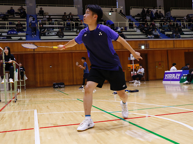 続く2回戦。日体大の馬屋原と対決した。第1ゲームは相手のプレーについていくことができず、苦戦を強いられる。しかし、第2ゲームは一転。粘り強くシャトルに食らいつき、攻撃の隙をうかがう。空いたスペースに鋭いシャトルを打ち込み、リードを奪った。勝負の第3ゲーム。互いに譲らず、拮抗した展開となる。しかし、中盤にミスを連発。連続得点を許し、流れを渡した。健闘したものの、ここで敗退となった。