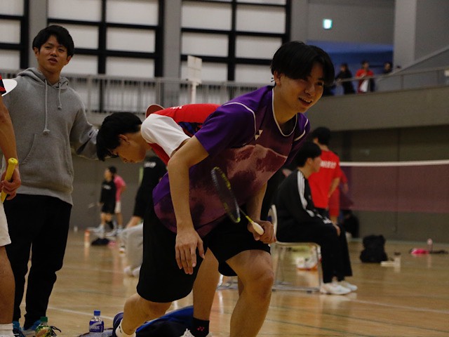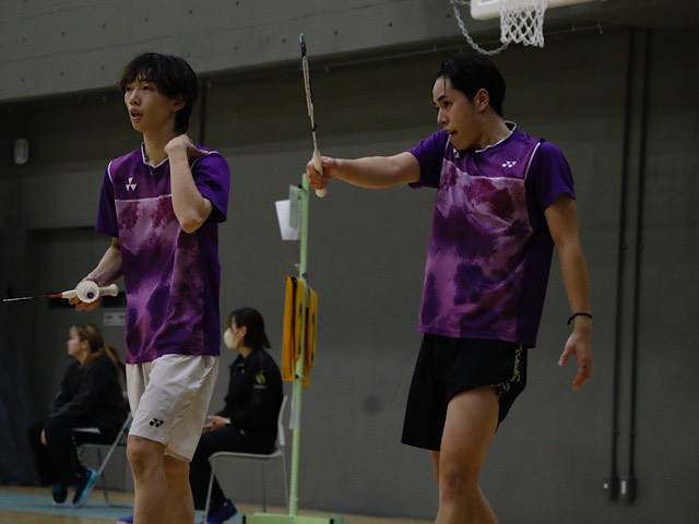 最初に4回戦進出を決めたのは、熊木(商2)・大森(スポ1)だった。3回戦で京産大と対戦するとシーズンを通して団体戦でも活躍を続けた2人は躍動。息の合った連係でポイントを量産すると第1セットを21-14で先取する。第2セットでもその勢いは衰えることなく、相手を圧倒。21-11で第2セットも奪い、ストレート勝ちを収めた。