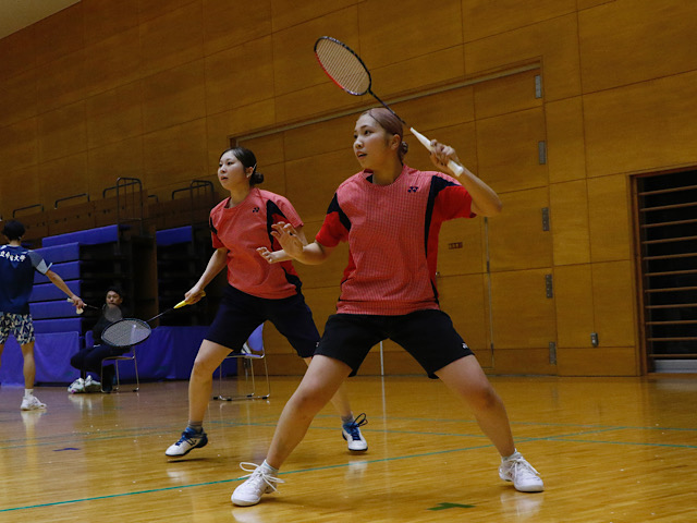 一方のダブルス。近松・松本ペアは相手ペアが棄権したため、準々決勝に進出した。対峙(たいじ)したのは関学大。第1ゲームは試合の主導権を相手に掌握され、反撃の糸口を見いだせない。悪い流れを断ち切れず、そのままこのゲームを落とした。気持ちを切り替え、挑んだ第2ゲーム。互いに譲らず2点を追いかける形でインターバルを迎えるも、5連続得点を献上し点差を広げられる。それでも二人はシャトルに食らいつき、同点に追いついた。試合はデュースにもつれ込み、激闘が繰り広げられる。しかし、二人の連係が上手くいかず失点。そのまま振り切られ、無念のストレート負けを喫した。