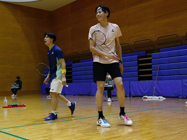 準々決勝は龍谷大の野村・片桐ペアと相まみえた。秋のリーグ戦での対決で敗北しており、決して侮れないペアだ。第1ゲームは序盤こそリードを奪い試合を折り返すも、その後6連続得点を献上。追い上げを図るもわずかに及ばず、17-21でこのゲームを落とした。続く第2ゲームは相手ペアのペースで試合が進む。強烈なシャトルを何度も打ち込まれ、守りに回された。反撃の隙をうかがうもむなしく、10-21で敗北を喫した。