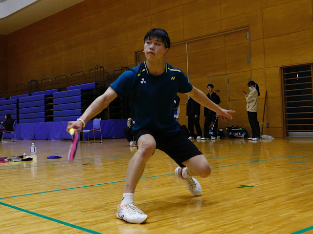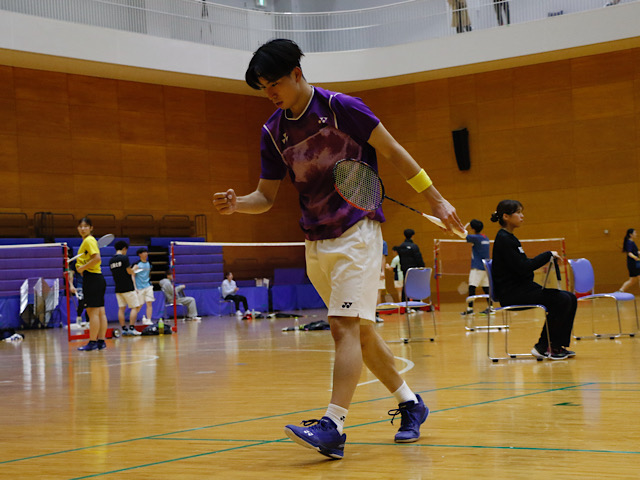熊木の4回戦。第1ゲームは実力伯仲の戦いを見せた。点差が全く開かず、緊張感が張り詰める。勝負はデュースへもつれ込む激闘となった。先にマッチポイントを握られるもシャトルに食らいつき、得点を許さない。攻撃の手を緩めず25-23でこのゲームを奪った。続く第2ゲームは主導権を掌握し、優位に試合を進める。堅実なプレーでポイントを重ね、21-10で勝利を収めた。