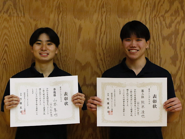 11月29日、龍谷大学専精館(京都府)で令和7年度関西学生バドミントン新人戦大会が行われた。大会最終日に実施された男子シングルスには山本(政策2)、熊木(商2)が出場。山本が準優勝、熊木が3位に輝いた。