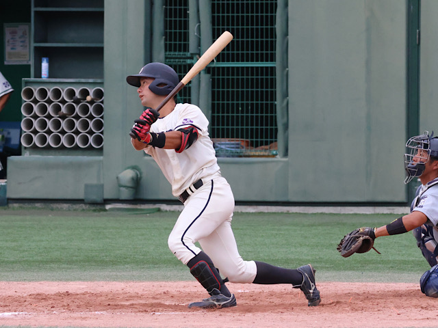 一方の打線は今日も初回から動く。先頭の堀内(法3)が左安打で出塁すると、浅野(法4)の犠打で1死二塁。ここで打席に入ったのは辻井(スポ2)。初球から左安打を放ち、1死一、三塁と好機を拡大する。しかし、後続が絶たれ先制点につなげることはできなかった。その後好機をつくるも、得点をあげられない展開が続く。