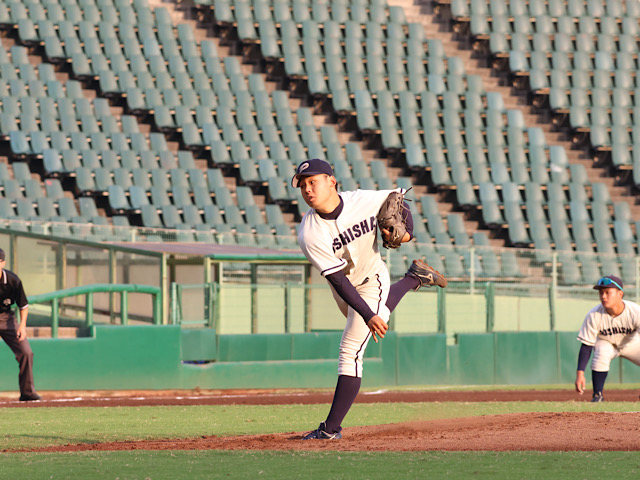 両チーム無得点のまま迎えた5回裏、近大の粘り強い攻撃が再び同志社を苦しめる。橋本裕に代わり内山(法1)がマウンドに上がった。先頭打者を三振で抑え、順調な滑り出しを見せる。しかし、後続打者に続々と安打を放たれ3失点し、1死満塁の状況で降板した。代わって登板した財原(スポ4)は勢いのある投球でゴロを誘い、併殺打として追加点を封じる。大量失点の危機を切り抜けた。