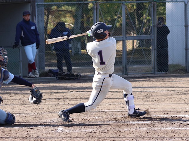 先攻の同志社は初回、先頭打者の西川(経1)が左安打で出塁。続く影山(スポ2)がセンター越えの適時三塁打を放ち、西川を生還させ先制点を挙げる。さらに、齊藤(法1)と川村(文情1)の適時打で試合開始早々に3点を奪い、順調な滑り出しを見せた。