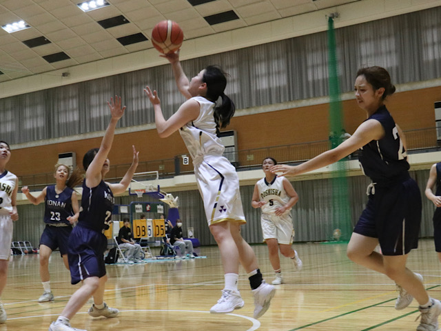 迎えた第2Q、同女はコート前方からオフェンスにプレッシャーをかけ、甲南大のスローインを5秒間防ぐことに成功。このまま勢いに乗たいところだったが、甲南大の反撃により3点差に迫られ開始3分、タイムアウトへ(21-18)。開始4分、甲南大に逆転されたが、直後に徳永の3ポイントシュートが決まり、再び逆転(25-24)。両者譲らない攻防が繰り広げられる。残り8秒、相坂がダブルチームをかけられるもファウルを奪い取り、フリースローを獲得。接戦を制し、33-30でハーフタイムを迎えた。