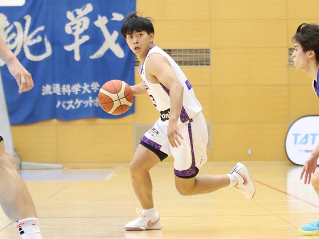 対流通科学大、スタートは柄澤(スポ3)、秋田(法3)、波多野(心3)、門川、大澤(商2)。今試合、主将の谷口(経4)が欠場。ポイントガードの穴を柄澤、田中(法1)が埋めた。ティップオフ後、司令塔の谷口がいない同志社はセットプレーで活路を開いた。ボールを持たない選手が空いているスペースを生み出し、柄澤がフリーの波多野にパス。簡単なシュートで得点を重ねた。しかし、流通科学大も長距離砲を沈め、ハイスコアな展開となった。第2Q(クォーター)では秋田と門川がチームをけん引し、最大9点差まで突き放す。途中出場のシューター尾上もオフボールから得点。守備面ではガードの田中と連携し、激しいディフェンスで流れをものにした。谷口の欠場で機会を得た4年生の安藤(スポ4)が3点シュートを射抜くとベンチもスタンドも総立ちで喜んだ。
