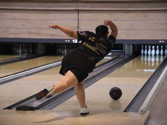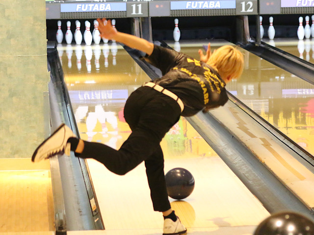 女子部は2試合ともに京産大と対戦。5週目1ゲームでは、石本が5本連続ストライクを獲得し224ピン、渡辺も205ピンと快投を見せた。しかし、相手選手が計10本のストライクを決め、同志社の429ピンに対し、446ピンを記録。惜しくもゲームを奪われた。続く第2ゲームでは、祈るようにボールの行方を見守る場面も見られた。渡辺が204ピン、石本が249ピンをマークし、ゲームを奪い返す。勝敗を分ける第3ゲーム。渡辺が183ピンと少し調子を落とすも、石本が212ピンを獲得する。25ピン差でゲームを制し、2-1で勝利した。