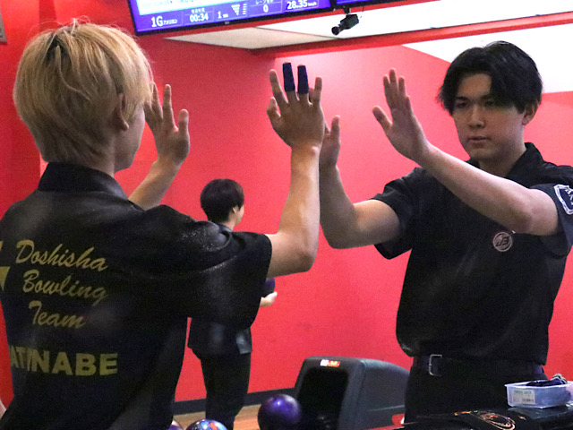 迎えた8週目の第1ゲーム。「試合会場との相性はあまり良くない」(渡辺)。そう語りながらも、勢いを落とさず計6本のストライクを決め、215ピンを獲得した。第2ゲームでは戸塚が勢いをつける。5本連続、計7回のストライクを決め、236ピンのハイスコアをマークした。続く第3ゲームでは戸塚が勢いを落とし162ピンとなったものの、渡辺が225ピンを獲得し試合を終える。「次戦が最後なので、しっかりと全勝で終わりたい」(戸塚)。秋季リーグ最終節となる次戦への意気込みを語った。