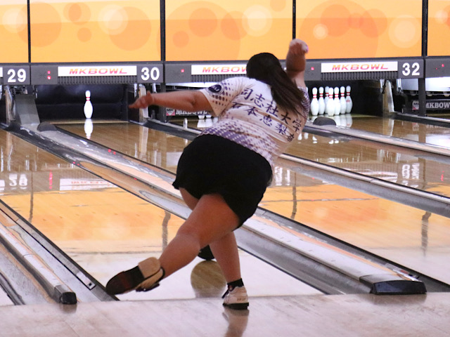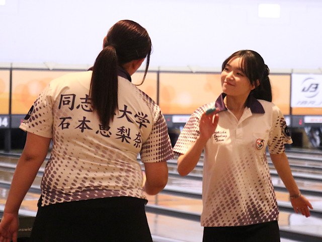 女子の部は第9週、第10週ともに京産大と対戦。相手選手の欠場によりアドバンテージのある状況でも気を緩めず、一投一投に集中して投球を重ねた。第9週第1ゲームでは、石本のスコアが伸び悩む。スペアを取りこぼす場面が続き134ピンとなり、悔しそうな表情を見せた。一方、戸塚は序盤から3連続ストライクのターキーを決め、快調ぶりを見せつける。計7本のストライクを決め、213ピンを記録した。続く第2ゲームでは、石本が調子を取り戻す。計5本のストライクを決め、前ゲームで課題となったスペアの取りこぼしも1度のみに抑えて、212ピンをマーク。戸塚も第1ゲームからさらに調子を上げ、計10本のストライクを量産。275ピンをマークした。第3ゲームでは、これまで存在感を示していた戸塚が178ピンと勢いを落とす。しかし石本がパワフルな投球で一気にスコアを伸ばし、ゲーム開始から7本連続ストライクを決め、245ピンの好スコアを叩き出した。