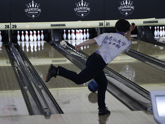 男子部は松本(商4)、岡田(スポ4)、熊、菅原、久保(理工2)、吉村(理工2)、伊地知(文2)、渡邉(スポ1)、平田(スポ1)、野澤(政策1)の計10名が出場。予選1日目は予選6ゲームが行われた。初戦から熊が3ゲーム全て220ピン台をマークするも、16位スタートとなる。また、渡邉が第1ゲームから256ピンの高得点を叩き出し暫定12位についた。その後の2回戦でも安定した投球で順位をキープする。1日目は上位に入れなかったものの、おのおのが安定した投球で順位をキープした。