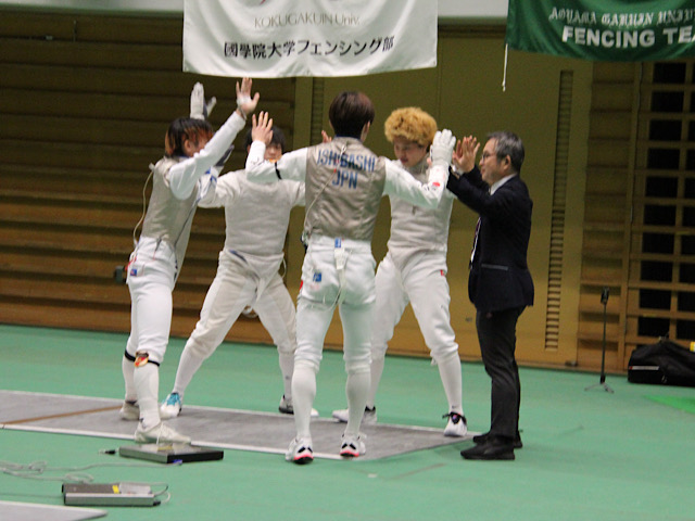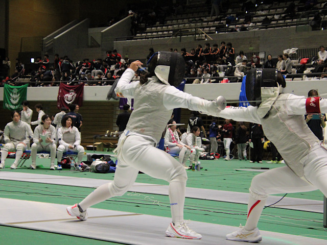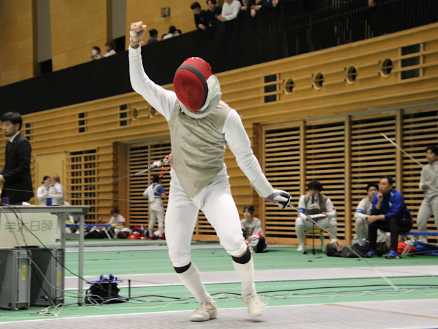 フルーレ男子団体戦には、竹本(心理2)、柿原(法1)、石橋(商1)、福山(スポ1)が出場した。各々が持ち味を発揮し、白熱の戦いを繰り広げた。初戦の相手は早大。1回戦、石橋が攻めあぐね、序盤は1-5と苦しい立ち上がりとなる。続く竹本が登場。前に一本大きく出てアタックを決めるなど、鋭い突きを見せて会場を沸かせた。竹本の気迫あるプレーで粘り強く得点を重ね、同点に追いつく場面も見られた。3回戦の福山はスピードで攻め続けるも、相手の反撃に遭い11-15でバトンを渡す。中盤、石橋が粘り強い試合運びで連続得点を重ね、試合を立て直す。柿原も積極的に攻め込み、同点に追いつく場面を作った。21-21の接戦から一進一退の展開が続くも、徐々に同志社のペースに。続く柿原が確実に点を重ね35-30とリードを広げた。最終試合、勢いに乗った竹本が怒涛の6連取で勝負を決めた。一本一本に気迫を込めたアタックで連続得点を奪い、最終スコア45-38で見事な勝利を収めた。