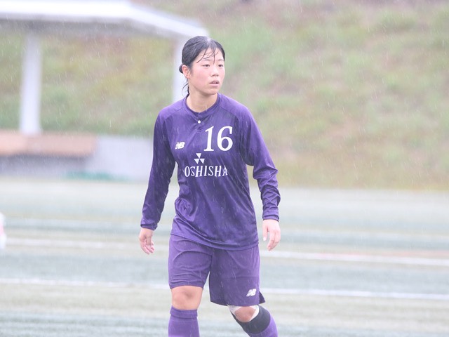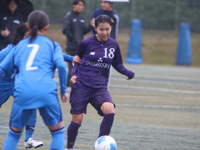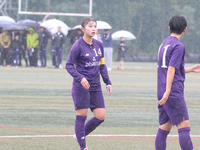 雨が降りしきる中、試合は立ち上がりから同志社ペースで進む。この日、右サイドに入った上川路(スポ1)がクロスを上げると2列目から飛び出してきた滋野(理工3)が合わせてゴールする。幸先よく、先制することに成功。その後は攻めあぐねる時間が続くも、同志社イレブンは追加点を目指し、戦い続けた。