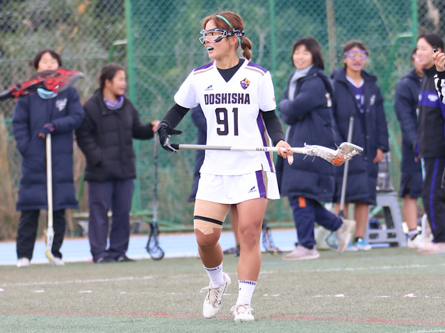 全国まであと1勝と迫った決勝戦で、同志社は関学大と対戦した。序盤から主導権を握ったのは同志社だった。前半開始直後、相手陣へ積極的に攻め込むと、パスを受けた選手が先制点を奪い、試合の流れを引き寄せる。勢いに乗った同志社はその後も果敢に攻撃を仕掛け、相手のファールを誘って2度のフリーシュートを獲得。しかし、相手ゴーリーの好セーブに阻まれ、追加点をとはならず。前半5分には、自陣に攻め込まれ、ゴール正面からのシュートを許して同点に追いつかれる。それでも同志社は動じない。同7分、ゴール前で味方のパスがこぼれたところを競り勝ち、鋭いシュートを突き刺して再び勝ち越しに成功する。ここから再び流れは同志社へ。次々とフリーシュートの好機を作り出し、前半だけで6度のチャンスを迎えた。終了間際にはフリーシュートから野瀬が相手のファールを受けながらも冷静に決め切り、スコアを3―1として前半を折り返した。