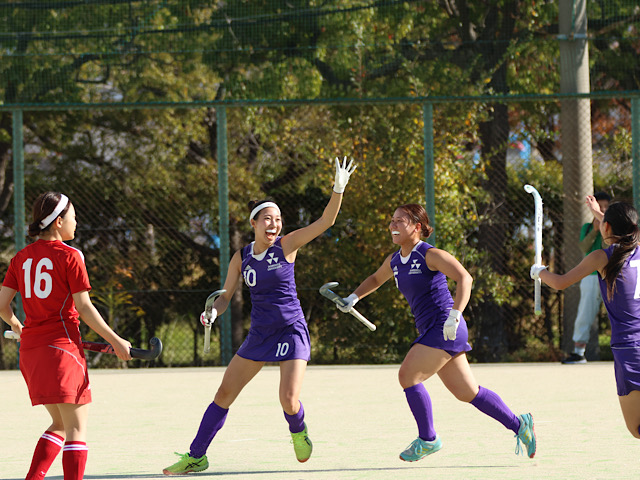 第3Q、前半と同様に同志社は攻撃の手を緩めない。6分、8分、9分と連続でPCを得ると、後半3度目のPCで待望の先制点が生まれる。供給されたボールをサイドにいた岡本が強烈なシュートを放つとボールはゴールに吸い込まれた(1-0)。「ストレートに打つのではなく、展開して空いたスペースからゴールを狙うことを意識した」(清水)。その後は集中して守備を固め、第3Qを無失点で終えた。