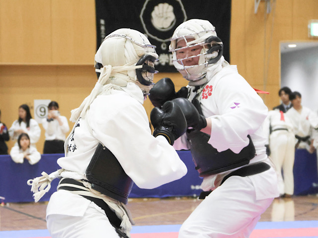 女子の部では8名が出場。中川、和田詩、廣井、岡は1回戦敗退、中野は2回戦敗退、北岸、近藤は3回戦敗退となる。ライバルたちとしのぎを削った中、特に和田愛の活躍が光った。「自分が楽しい拳法ができた」(和田愛)。2回戦では素早い攻撃で面突きを奪い、優勢勝ちを収める。勢いそのままに挑んだ3回戦では、相手をパワーで圧倒し胴突きで一本。さらに面突きを決め、次戦へ駒を進めた。しかし、4回戦は苦戦を強いられる。試合序盤、攻め切ることができない。試合終了直前に相手を押し倒すも一本を奪えなかった。決着がつかず、勝敗は判定に委ねられる。結果は1-2で判定負け。ベスト8で今大会を終えた。