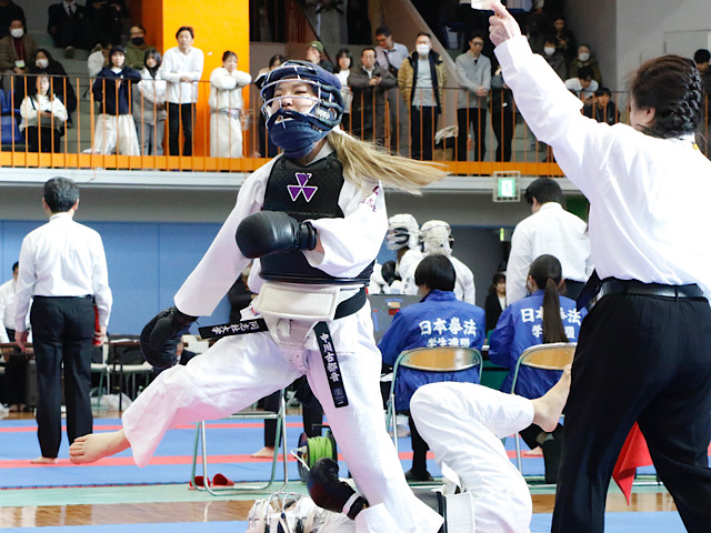 初戦は国士舘大との対決。先鋒の北岸、中堅の和田愛は相手を圧倒し快勝。大将戦では近藤が相手を押し倒し面突きを決めた。その後相手選手の負傷で勝利となる。