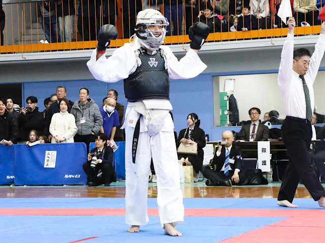 2回戦からの出場となった同志社。早大と相対した。先鋒の松尾が二本を奪取し、続く湊本も白星を挙げる。鎮西、河野は先に一本を献上するも立て続けに突きで二本を取る。武重、光武、西村も相手を寄せ付けない強さで勝利。7-0の快勝で次戦へ駒を進めた。