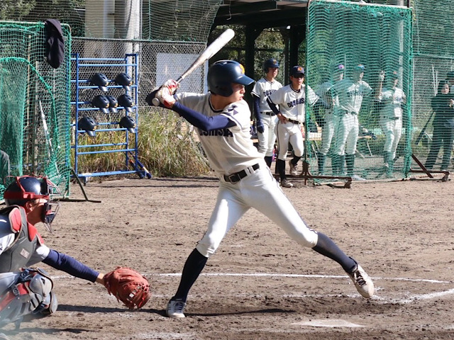 5回表からは浅野(スポ2)がマウンドに上がる。危なげない投球を見せ、7回まで無失点に抑えた。一方の打線はつながりに欠ける。得点圏までランナーを進めるも、あと一本がでない苦しい展開が続いた。