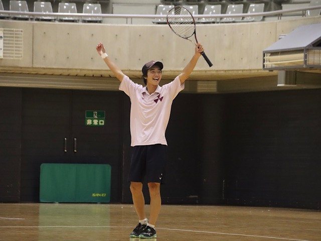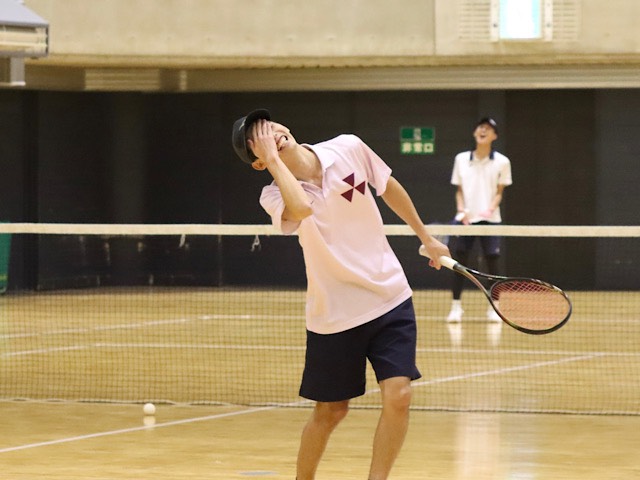 続く清水・宮田ペアと佐藤・宇都ペアの初戦も、同校対決に。序盤は佐藤・宇都ペアがボレーミスに苦しみ2ゲームを落とすが、第3ゲームを奪い返す。清水・宮田ペアがリードで迎えた第4ゲームでは、互いに譲らぬ展開の末、宇都が強烈なスマッシュを放ちデュースに持ち込む。デュースを4度繰り返す激闘となったが、最終的に清水・宮田ペアが地力を見せ、G4-2で勝利した。