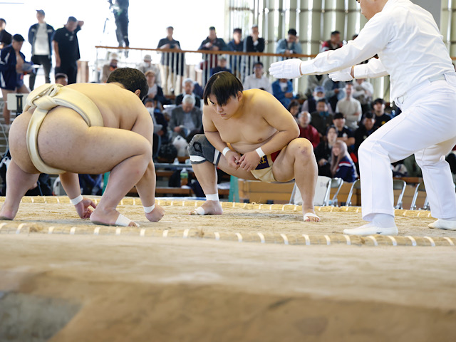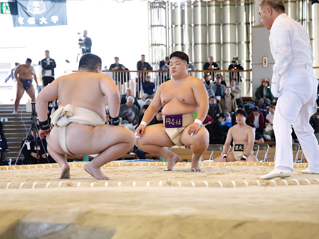 1日目は個人戦が行われた。同志社からの出場は、竹林(スポ4)、齋藤(商3)、國下(商1)、堀(法4)、李(商2)が出場。一回戦で齋藤は強敵の直江(明大)と対戦した。開始直後から果敢に攻め込むも重心をずらされ、突き落としで敗北を喫す。続く國下の対戦相手は後藤(國學院大)。体格差があったが油断せず、体を相手の下へ潜り込ませ、そのまま押し出しを決めた。続く2回戦ではふたたび体勢を低くし攻め込むも突き落としで勝ちを逃した。