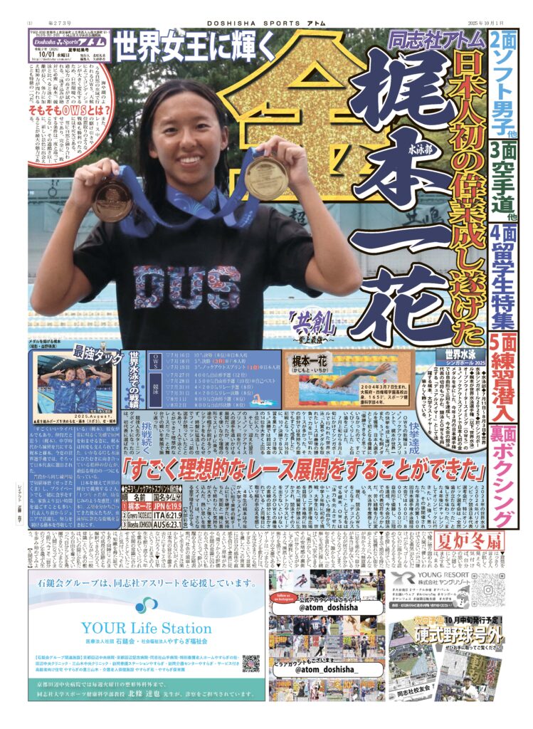 2025-10-01 273号夏季結果号 発行のお知らせ 本日夏季結果号を発行いたしました。 1面は水泳部で、世界水泳選手権オープンウォータースイミング(OWS)で金メダルを獲得した梶本一花選手、裏面はボクシング部の関西優勝を取り上げました。 ぜひこちらからご覧ください。 1面 裏面