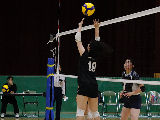 相手に先制点を許し始まった第1セット。序盤から#1八木(法4)の力強いアタックと相手の意表をついた巧みなフェイントで流れを作った。終盤には#5西躰(スポ4)、#13宮口(法4)が登場しサーブで相手を圧倒しつつ、#2岡本(社4)や#3岡田(スポ2)の速攻で得点を重ねる。また、セッターである#10今川(文情1)が自らアタックを決め、二段トスを#7三宅(スポ3)が打ち切るなど、第1セットからチーム全員が積極的に得点を狙う姿勢が光り、25-14で第1セットを獲得した。