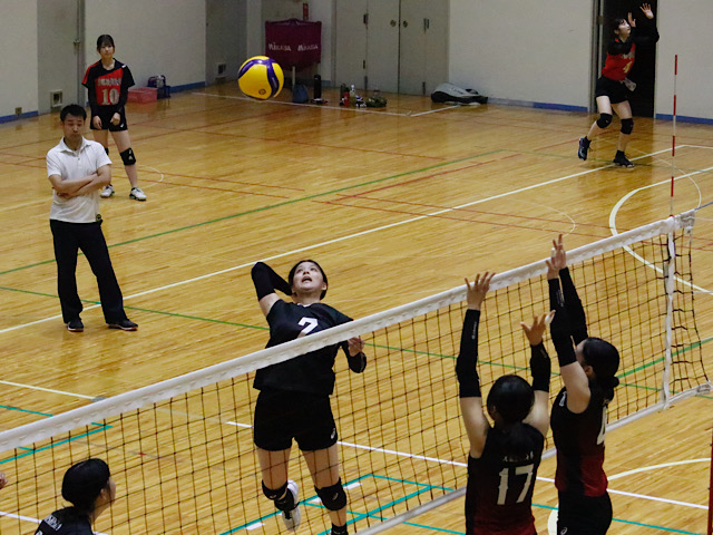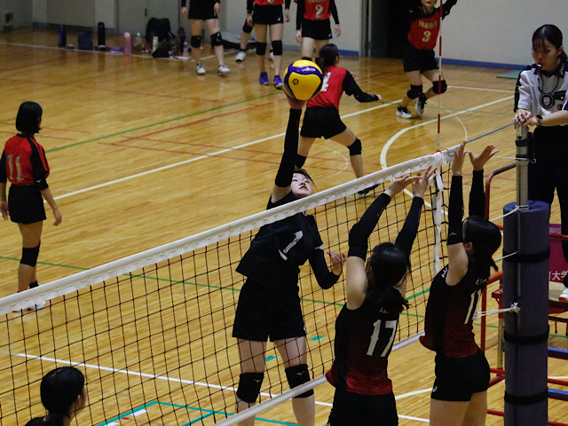「全力を出し切ろう」 (八木・法4)。気持ちを1つにして臨んだ第1セット。序盤から終盤に至るまでシーソーゲームが続き、接戦が繰り広げられた。八木をはじめ#9陶原(GC1)、#4神内(スポ3)が速攻やフェイント、プッシュを織り交ぜながら攻撃を展開し点を重ねるが、両者互角の粘り強さを見せ、点差を広げることができない。相手の鋭いスパイクの連続に苦戦しながらも、#12谷口(経2)を筆頭に選手全員が全身でボールに飛び込み、必死でボールを繋ぎ続けた。終盤には#2岡本(社4)がブロックアウトを誘い逆転。デュースにもつれ込んだが強硬な相手に一歩及ばず、27-29で第1セットを落とした。