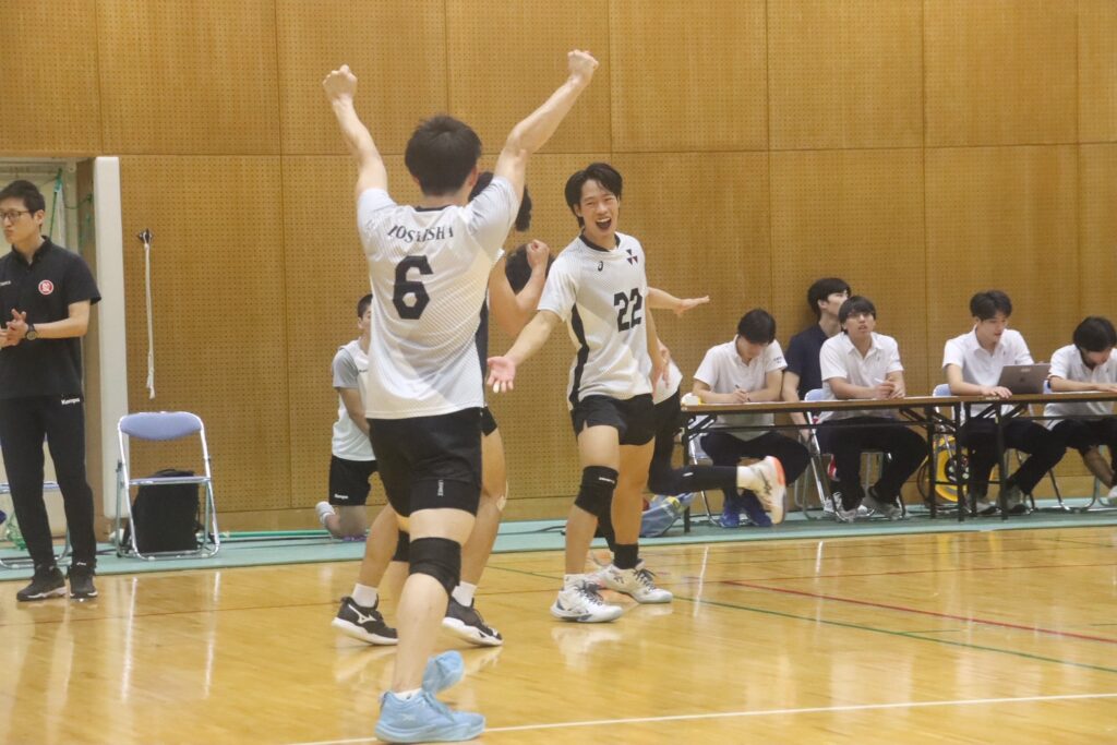 続く第2セット。序盤から立命大のサーブが走り、同志社は苦しい展開を強いられる(3-7)。池田が客席まで走ってボールを繋ぐ好プレーや、テクニカルな背面ショットでチームを勢いづけるも、得点には繋がらず、連続失点を許した(9-18)。しかし、小田がサービスエースを決めると、一気に同志社に流れが戻る。「自分のプレーで引っ張っていくぞと思ってやっていた」(森川祐)。その言葉通り、主将・森川が怒涛の4連続得点を挙げ、4年生としての意地と責任をプレーで体現。最大9点にまで開いた点差を、1点差にまで縮めてみせた(20-21)。さらに池田、﨑山も続き得点を重ねたが、立命大の攻撃に対応しきれず、22-25で第2セットを落とした。