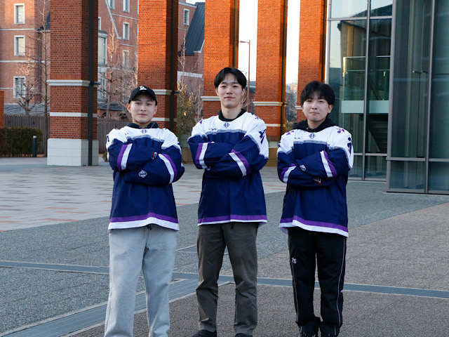 関西大学たかつきアイスアリーナ(大阪府)を主な練習拠点として日々活動を続けるアイスホッケー部。今年は主将・阿部、長谷川、爰保の3名が取材に応じてくれた。