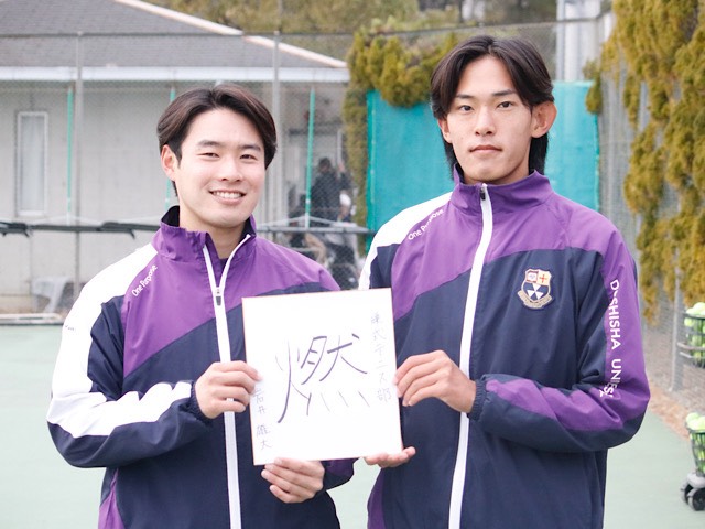 岩井→渡邊 渡邊くんはまだ1年生なんですけど、高校生の頃からインターハイベスト4に乗ってる選手ですごい強い選手っていうのは分かってたんですけど、リーグ戦とか一緒に戦ってみてフィジカル面の強さもそうなんですけど、人として周りに与える影響の多い選手が入ってくれたなっていうのはすごい感謝してます。オフの日に一緒に遊ぶとかはないんですけど、居残って練習したりとかすごいテニスにひむきに向き合ってくれてますし、1年生なのに戦績も一番出してくれてる選手なんで、これからの同志社のテニスを背負っていく選手として、自分はキャプテンとして彼ら後輩たちがいい環境でテニスできるような環境づくりができたらなっていう風に思っています。