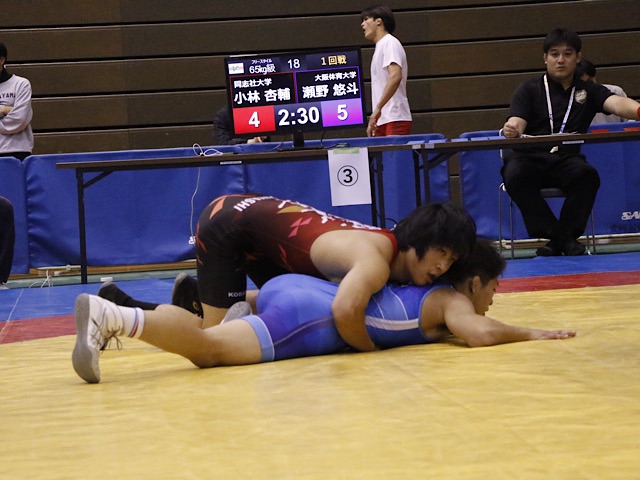 小林は初戦で瀬野(大体大)と対戦。前半約1分に場外で1点を失うと、すぐにローリングで逆転に成功。しかし同2分30秒に連続ローリングを受け、ビハインドのまま前半が終了する。後半では、激しい攻防を制し、ローリングで1ポイント差まで迫ると、小林の勢いは止まらず再びローリングを決めた。しかし、残り20秒を切ったところで相手の反撃を受ける。再び逆転を許しそのままポイント負けとなった。