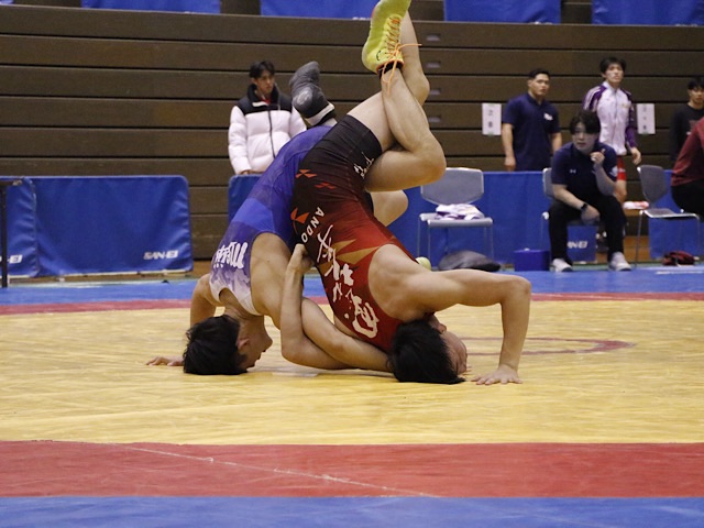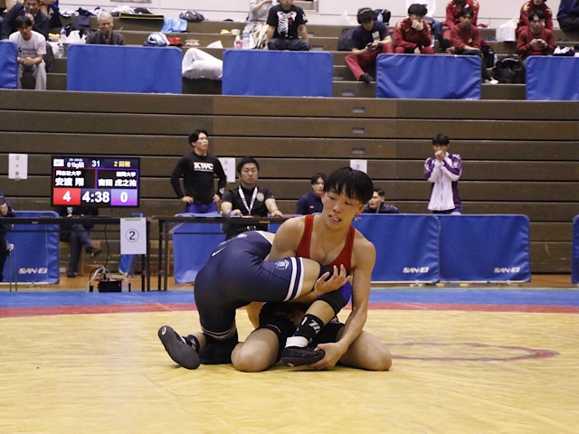 安渡は初戦、吉田(福岡大)と対戦した。開始直後は膠着(こうちゃく)状態がしばらく続いたものの、相手が姿勢を崩した隙に両足を奪い、連続でローリングを決める。開始1分30秒が経った頃、右足を狙ったタックルからのローリングで追加点を奪取。その後、相手のタックルを見事に避けると反撃に転じ、4ポイントを獲得。10-0と圧倒的な力差を見せつけて準々決勝進出をつがとった。